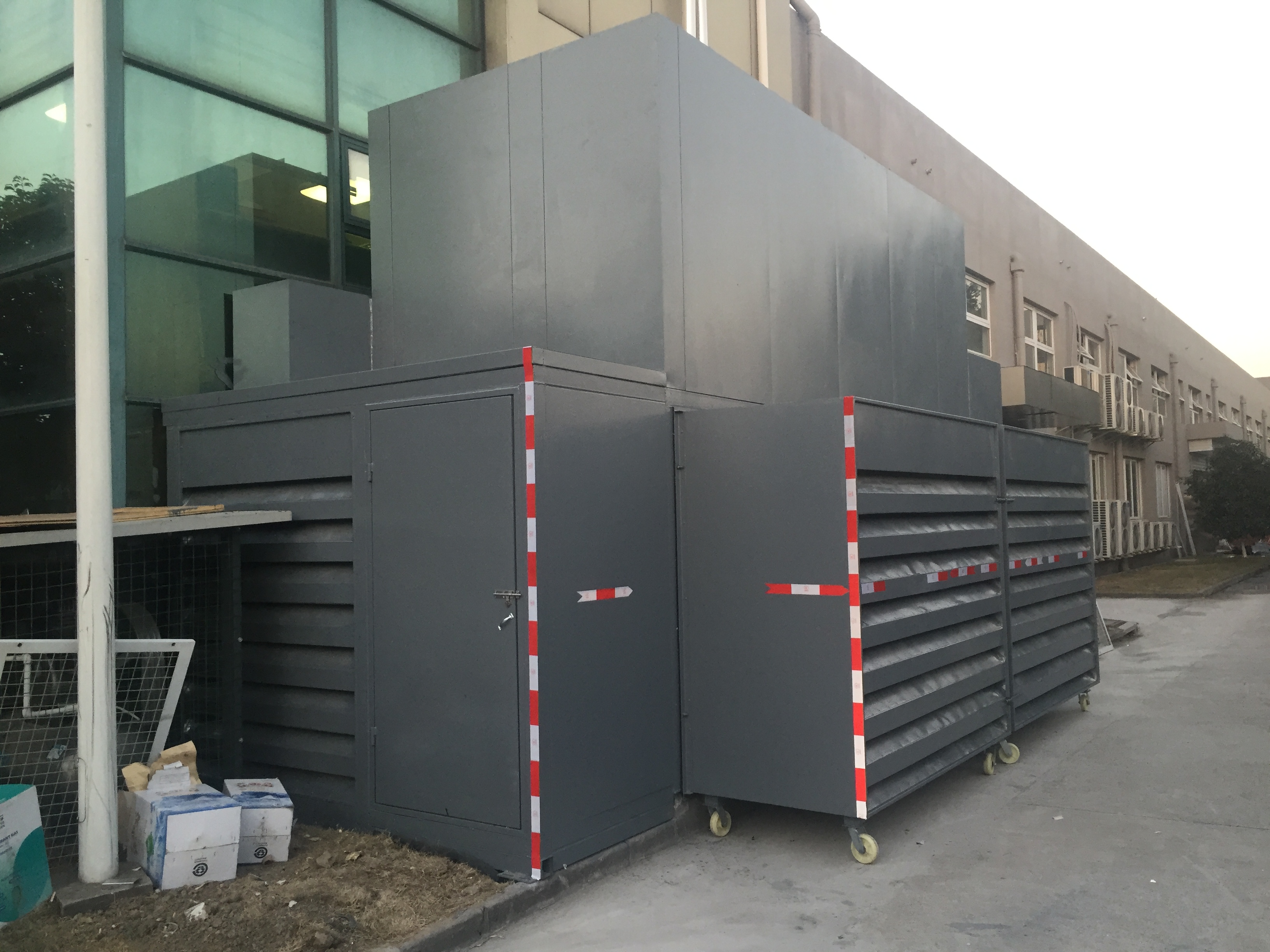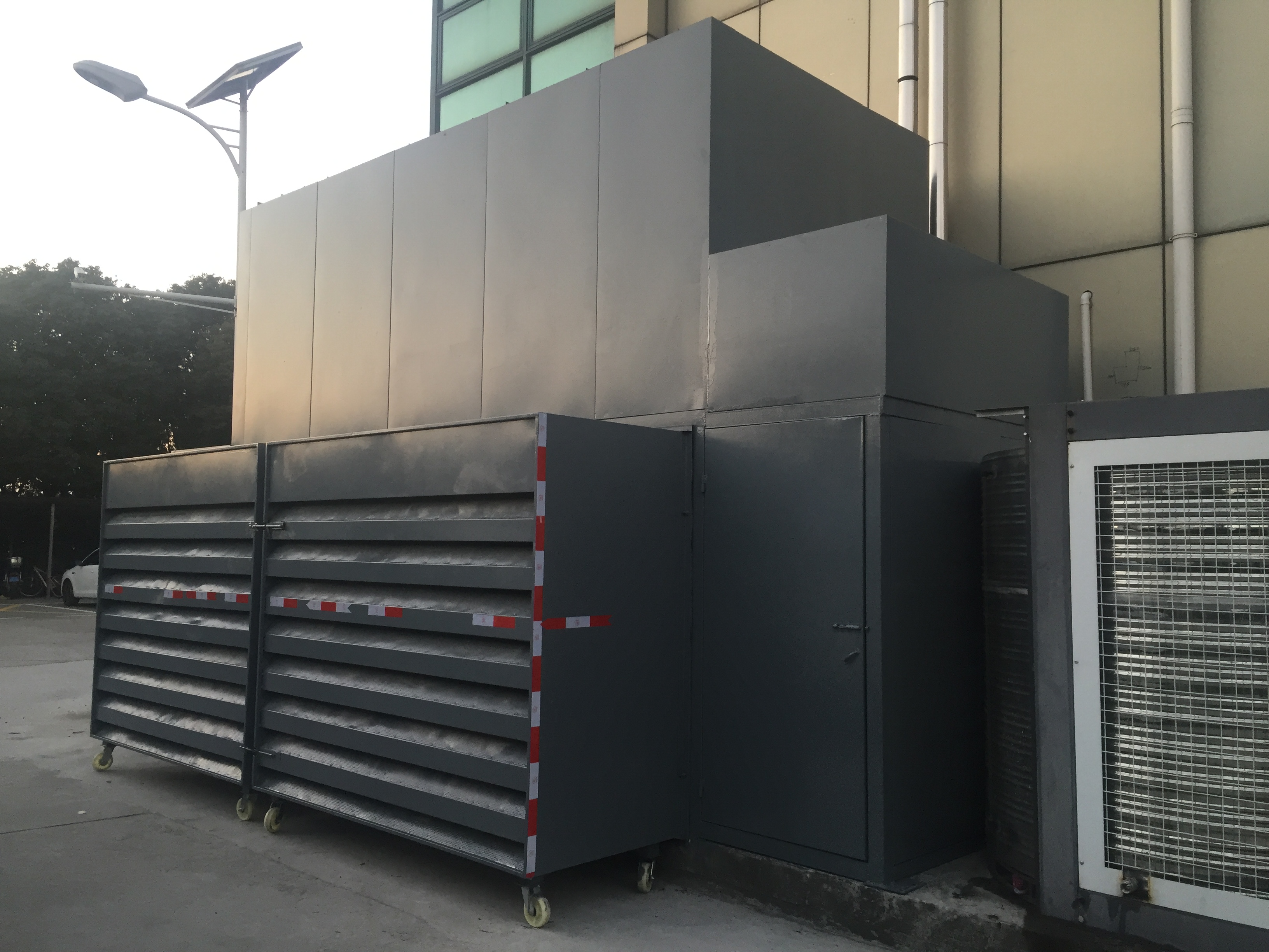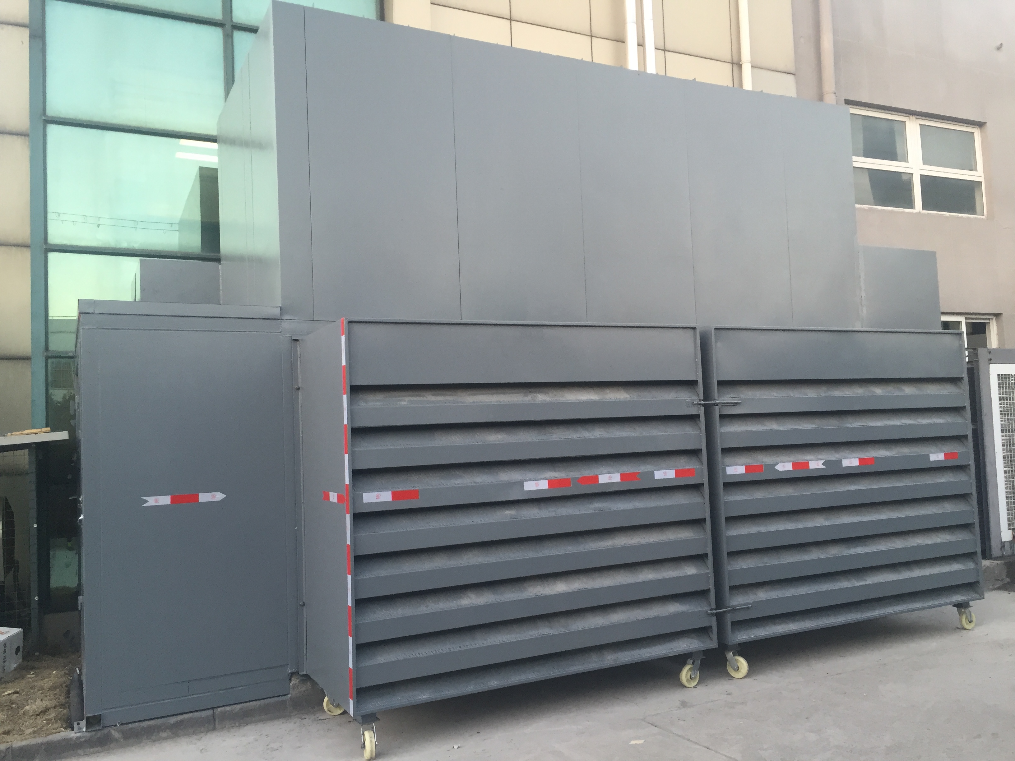 空調外機整體降噪設施由出風消聲器、補風消聲器、進風消聲百葉及(jí)附屬(shǔ)檢修門組成。